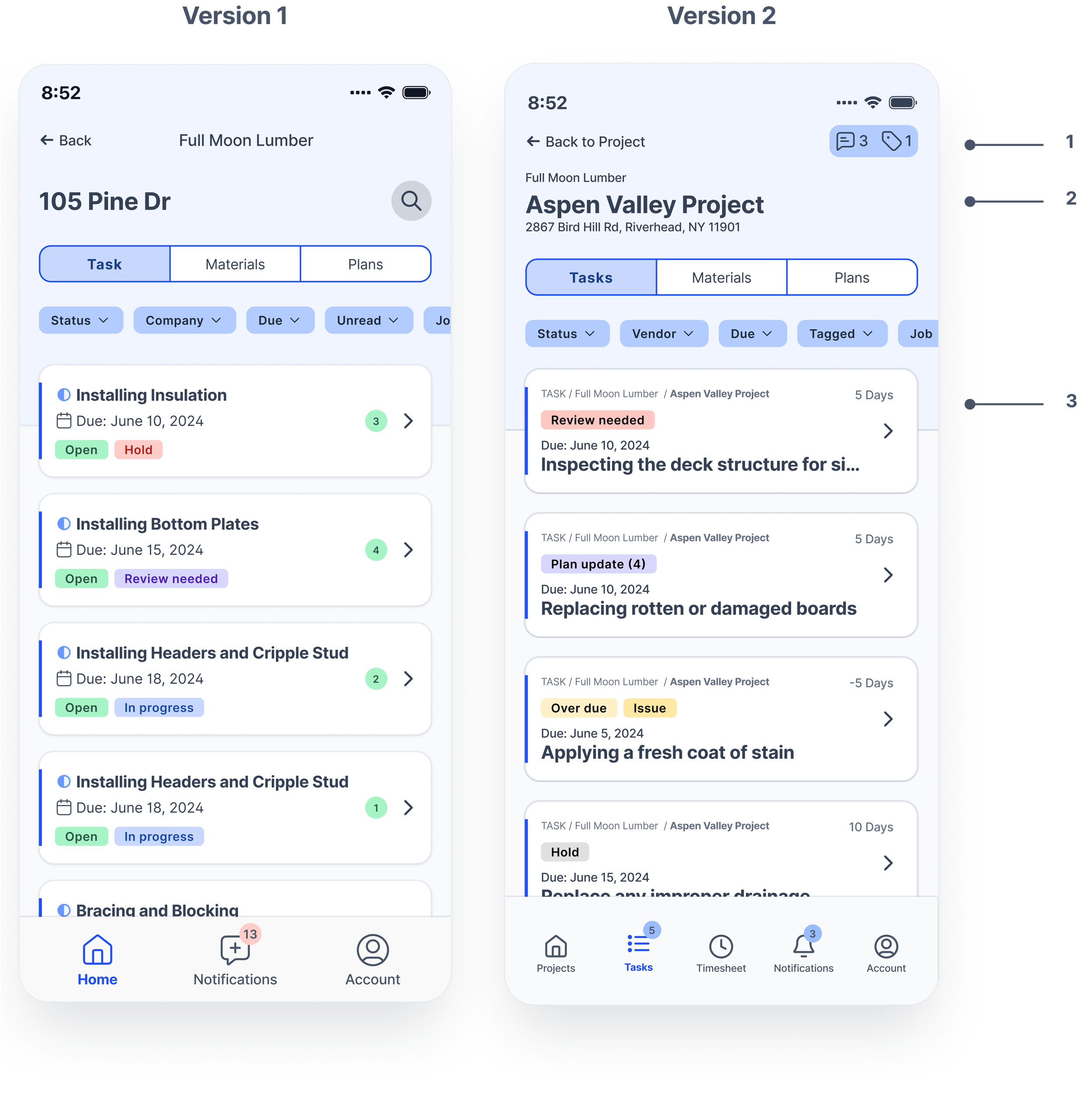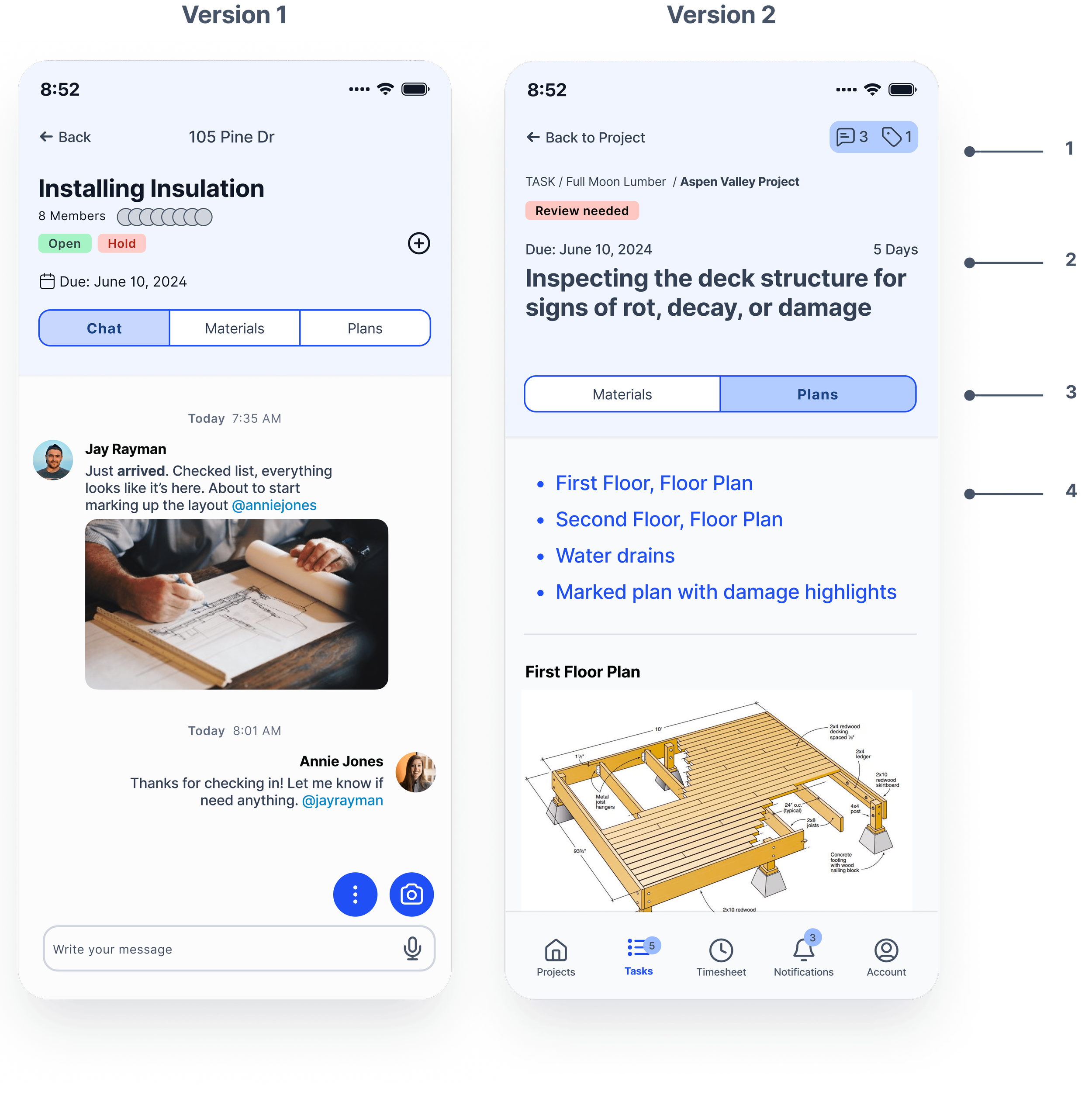 From user interviews and the affinity map, I identified three key aspects for effective on-site management: firstly, continuous communication through chat, photos, and notifications keeps everyone informed; secondly, regular inventory checks and material availability; thirdly, access to the latest plans, notes, and markups.