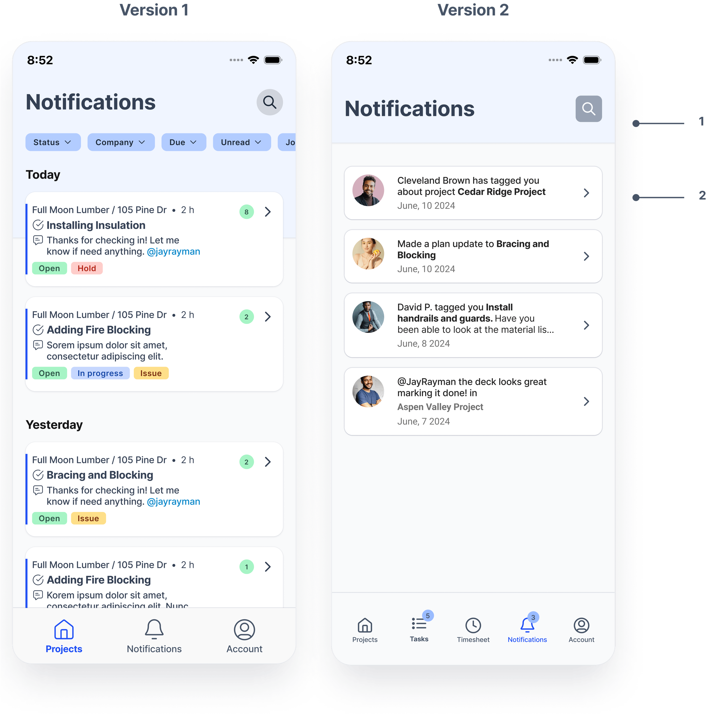 Jake and Tiffany, always-present , informative and supportive, ensure I remain grounded and focused. Their day-to-day on-site interactions, mostly through mobile devices, contrast with my work setup, pushing me to tailor solutions from their perspective. Emphasizing mobile-optimized communication, documentation, and notification systems, my goal is to facilitate seamless information flow. Jake and Tiffany (users personas) represent the information I gathered from user interviews examined with POVs, HMW, and affinity mapping. I am thankful for them keeping me on track!